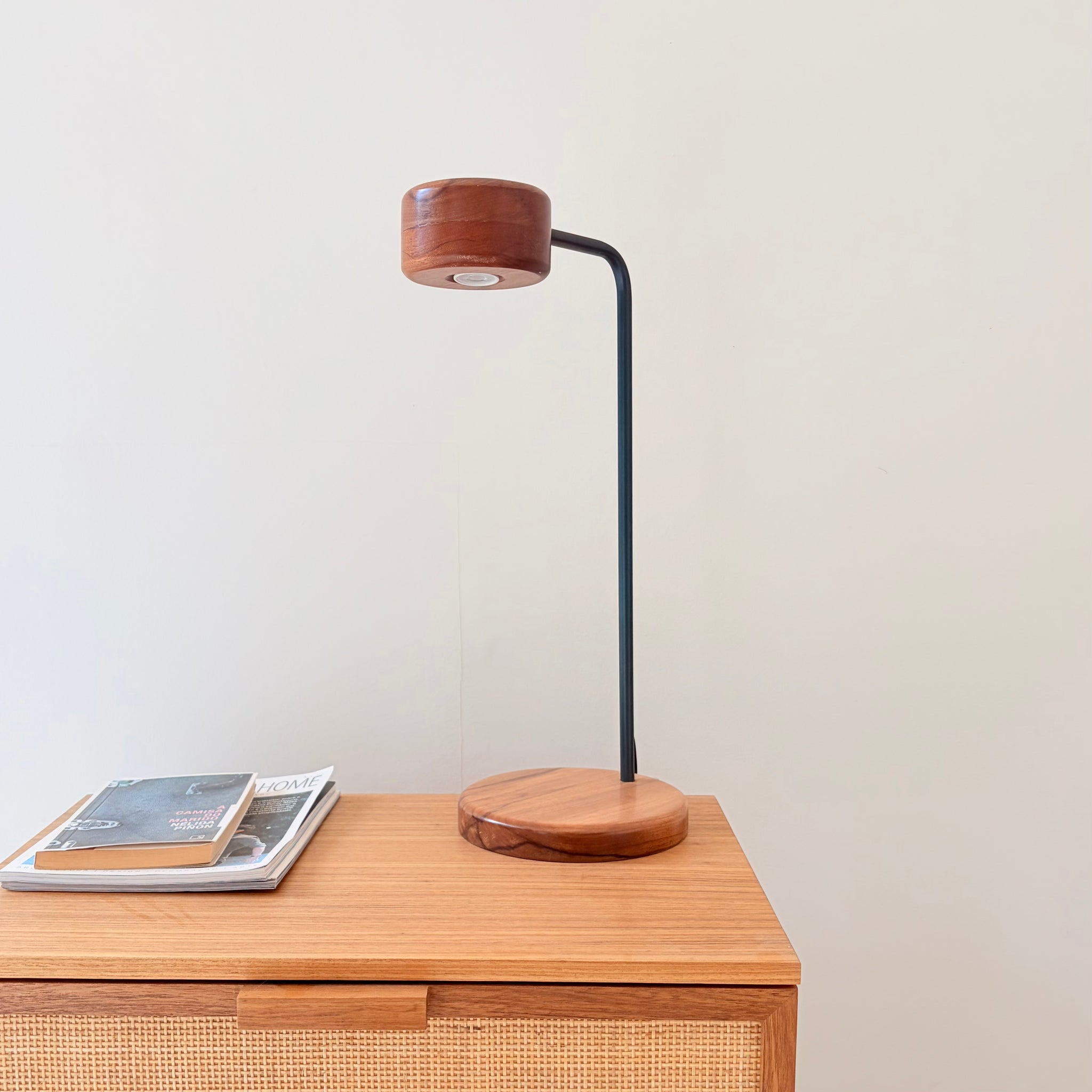 Componentes em aço e madeira maciça Jequitibá.Dimensões: A 50cm x P 25cmCabo preto de alta qualidade.Acompanha lâmpada LED mini G4 (2 pinos), já inclusa, substituível em caso de queima.